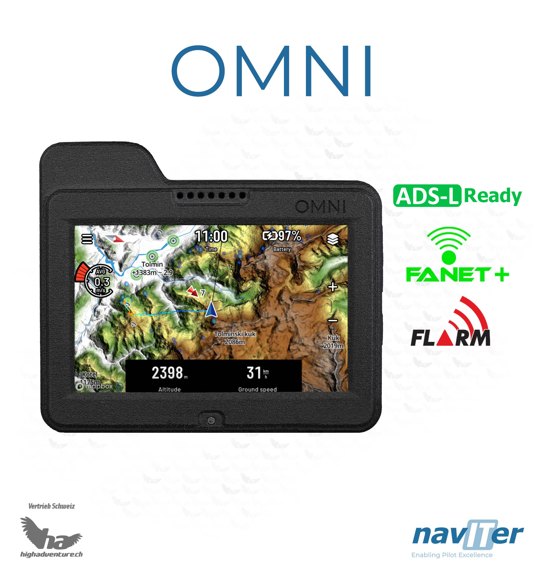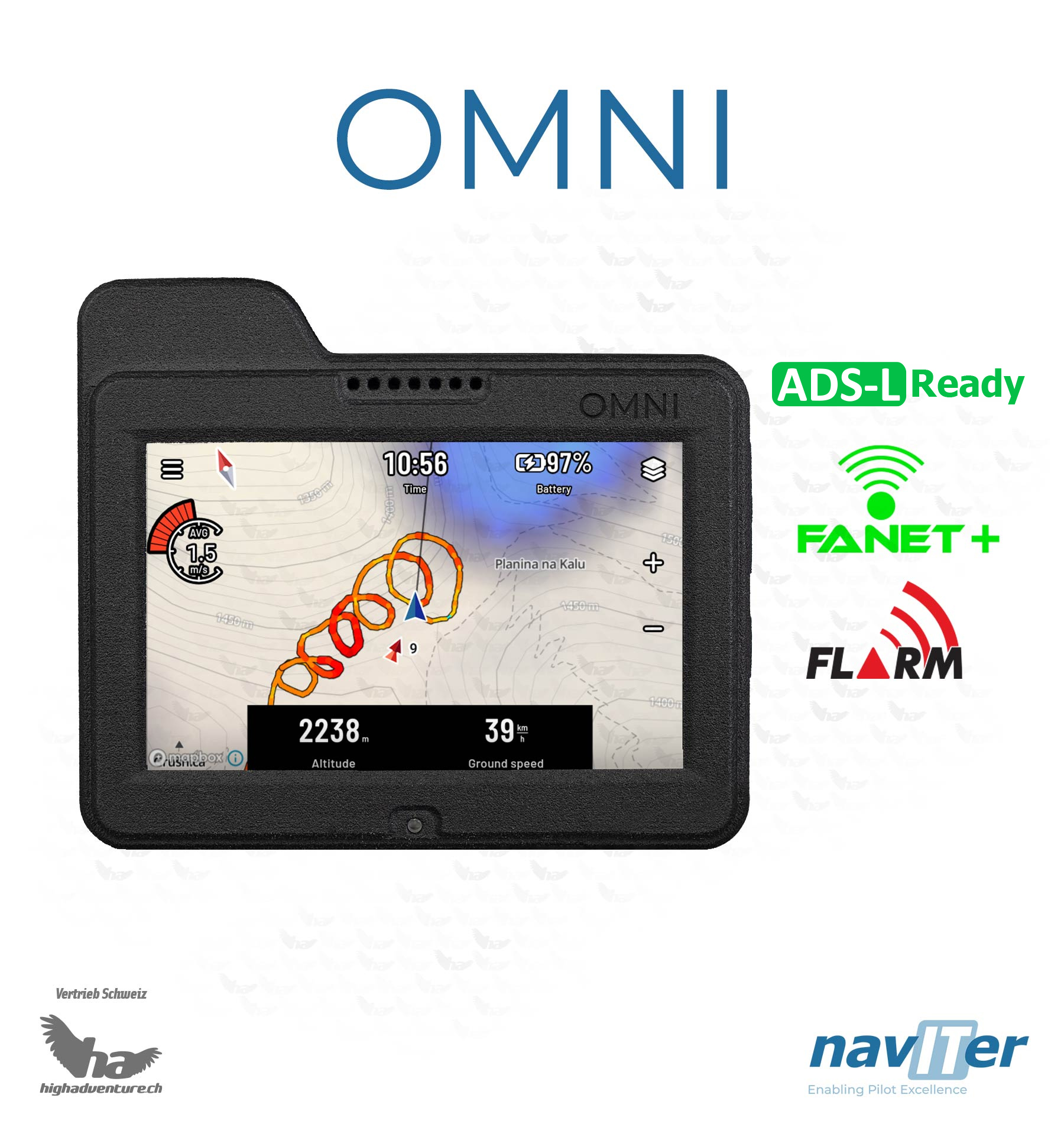 Ausgestattet mit einem beeindruckenden 3,5 Zoll grossen Full-HD-Bildschirm, der auch in gleissendem Sonnenlicht kristallklare Informationen liefert, ist das Omni der perfekte Begleiter für jeden Piloten. Die empfindliche Druckdose für den Variobetrieb reagiert blitzschnell auf jede Veränderung, und das Fanet+ & Zwei-Wege-Flarm (zeigt auch Segelflugzeuge, Hubschrauber und andere Flugzeuge am Bildschirm an) mit eingebauter Antenne sorgt für eine erhöhte Sicherheit in der Luft. Die Touch-Display-Bedienung funktioniert so mühelos wie bei einem modernen Smartphone, sodass sie sich voll und ganz auf Ihren Flug konzentrieren können.